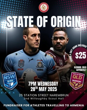 Get ready, Blues fans! The greatest rivalry in Australian sport is back, and you're invited to experience all the heart-stopping action at our State of Origin fundraiser for our athletes travelling to Armenia. Join us on Wednesday, May 28, 2025, at the 2nd Willoughby Scout Hall, Naremburn, for a night of epic rugby league. Whether you're a New South Wales or Queensland suppporter, come and soak up the atmosphere as we watch the Origin series opener with kebab. Entry includes: 1x kebab and 1x soft drink. Note: Acoholic drinks will also be available for purchase on the night.