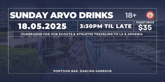 Join us Sunday, May 18 at Pontoon in Darling Harbour for a fun-filled afternoon of drinks, music, and good vibes. 🍹⛱️ 🪩 All proceeds will go towards supporting our athletes and scouts travelling to the Pan-Homenetmen Games in Armenia & LA Scout Camp ⛹️‍♀️ ⚽